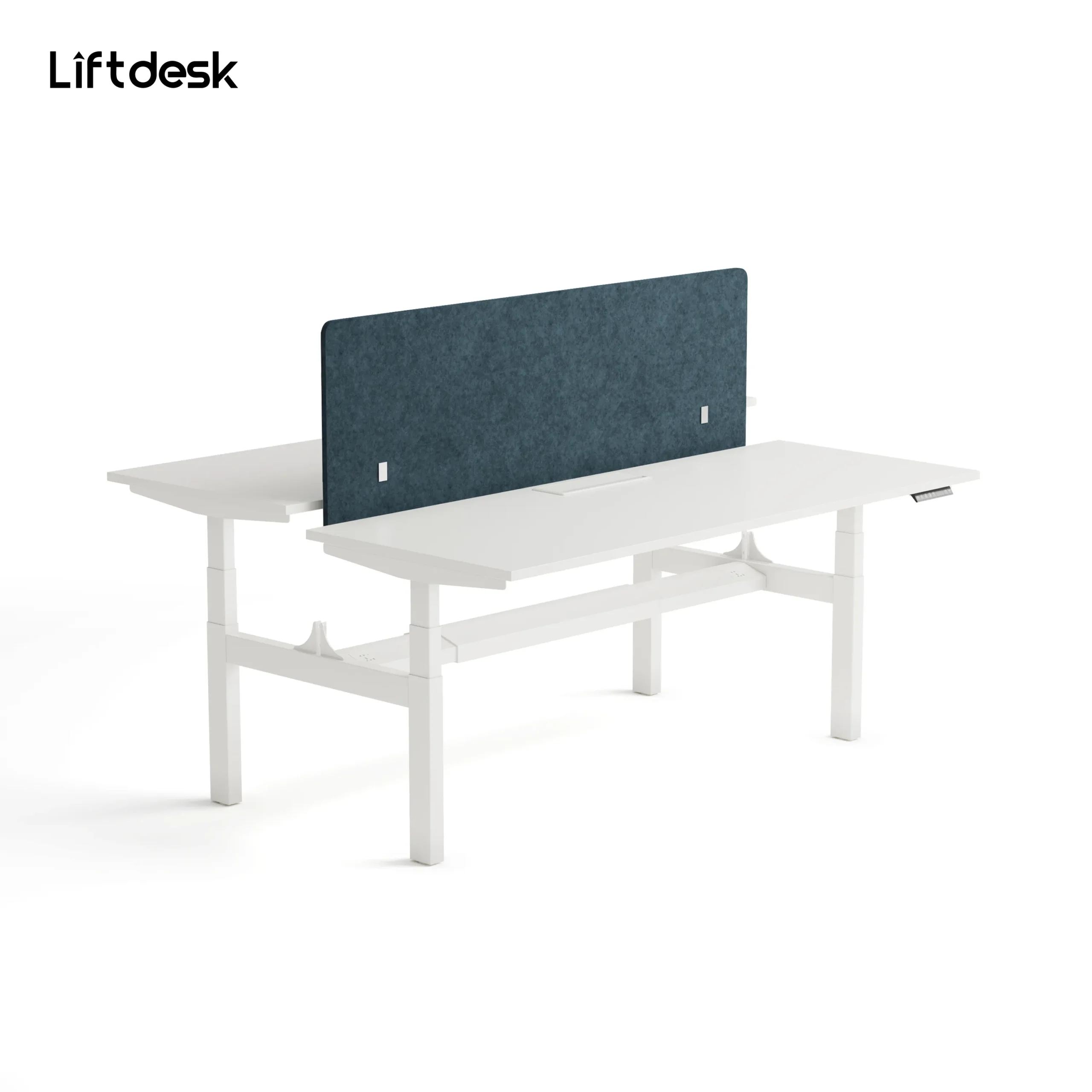 This robust 2-person standing desk workstation features high quality desktops and a heavy-duty steel frame, providing reliable lifting power for shared workspaces. The modular design includes desk panels for enhanced privacy and cable management, creating an organized environment perfect for collaborative projects or side-by-side workstations.